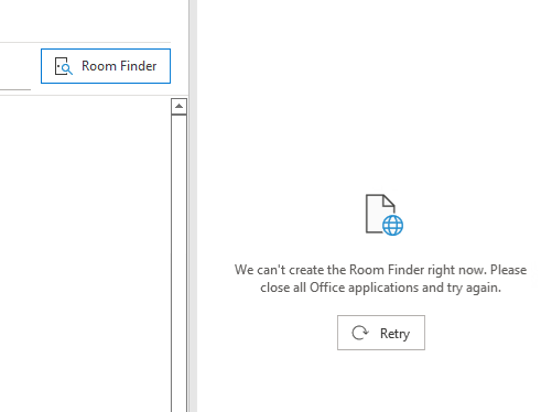 Problem: Room Finder works in OWA but in Outlook we get an error: We can't create the Room Finder right now.